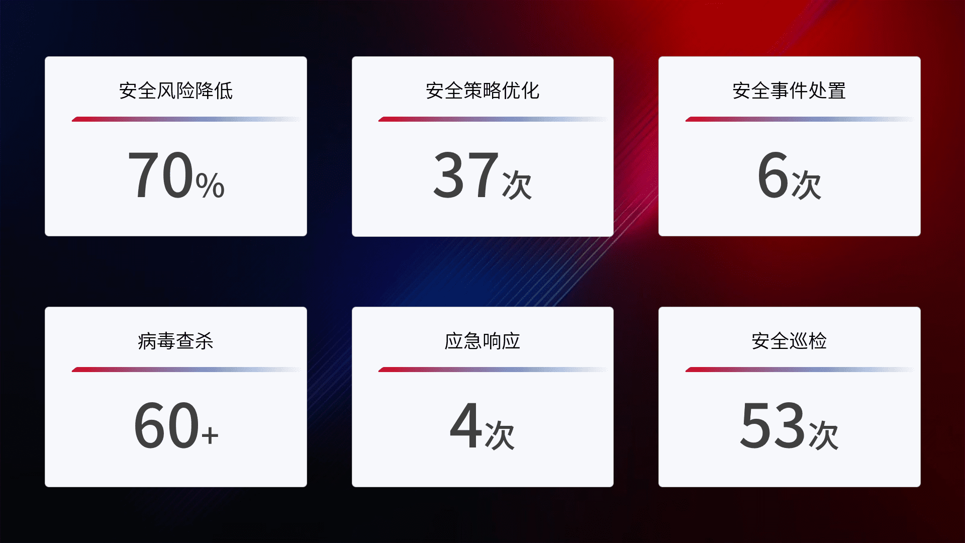 提供全面的安全事件报告体系,,包括处置报告、、、、周报、、、季度和年度总结,,结合持续监控,,,帮助客户深入了解网络安全状况。。