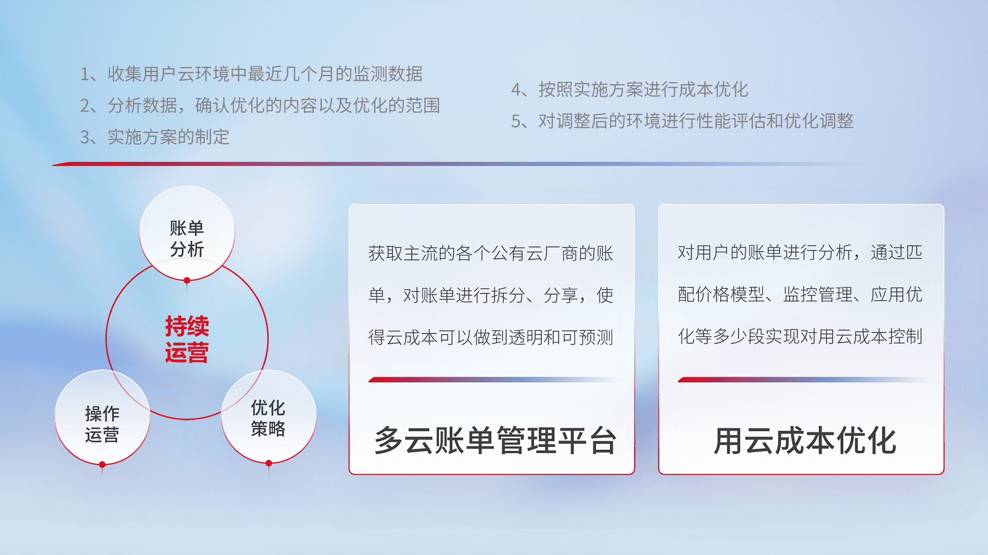 通过多云纳管,,,,以统一的资源数据模型把客户的云资源进行抽象和封装,,,进而实现对多云资源的统一操作,,保障云资源管理的可靠性、、、稳定性与可用性。。。。量身定制化运维内容,,配置、、、开发运维、、、补丁管理、、、备份、、、、监控、、认证和访问管理、、审计和日常巡检等,,,保障在用云过程中的可靠度,,,,稳定度以及高可用率。。。